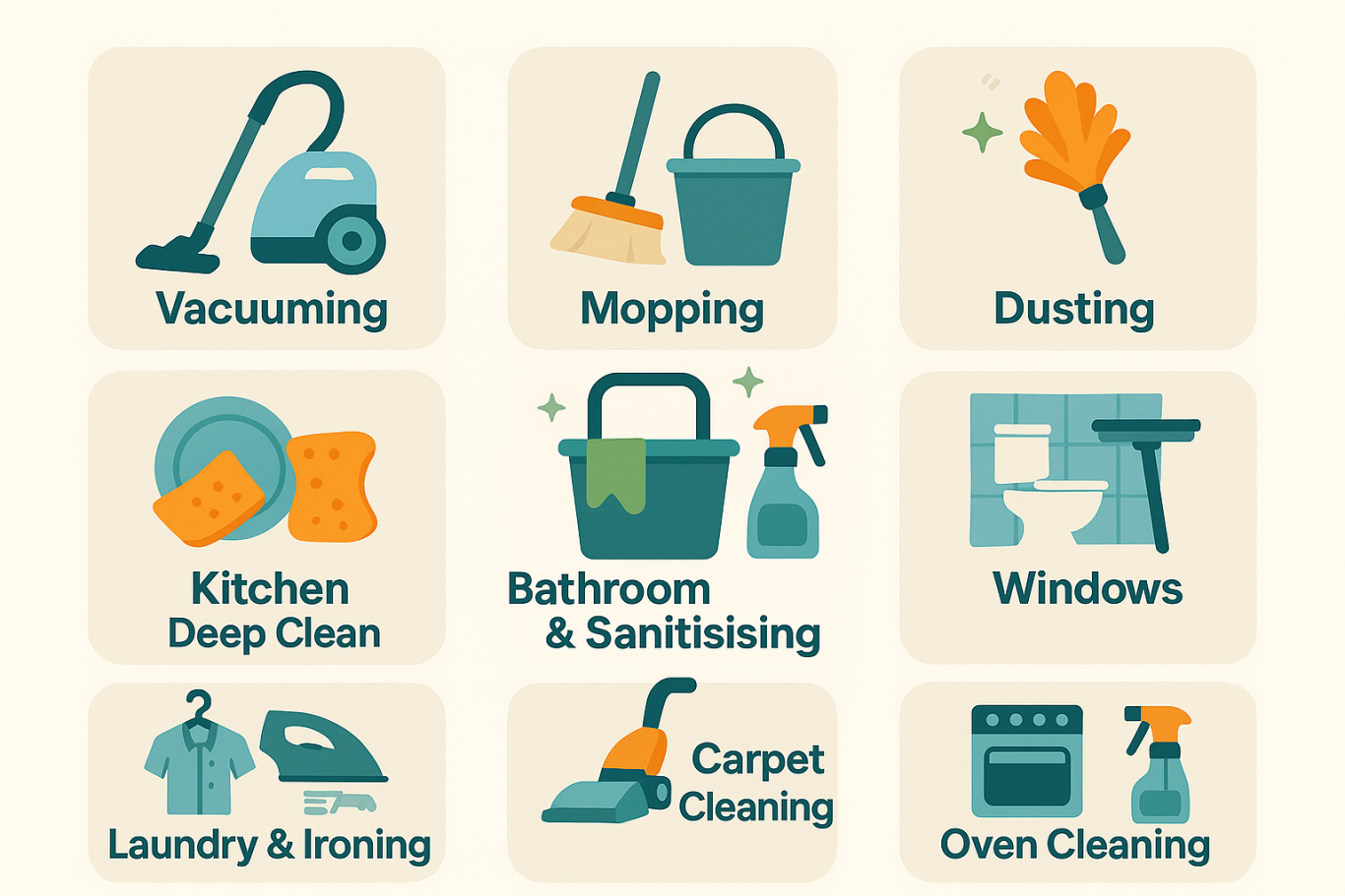 - General rooms: dust high/low, wipe skirtings/doors, cobweb removal