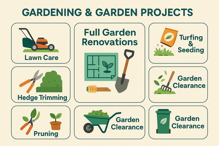 - Groundworks: clearance, levelling, turf/soil import & improvement